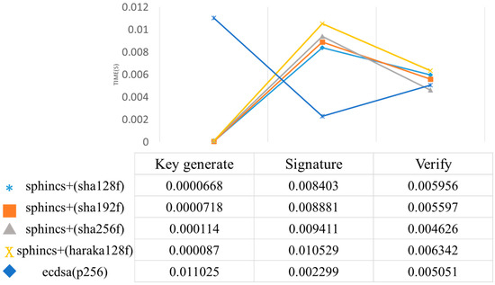 The computational performance comparisons between SPHINCS+ and ECDSA in terms of key generation, signature, and verification under the configurations of sha128f, sha192f, sha256f, and haraka128f against the P-256 curve of ECDSA are shown in Figure 13. The table below the graph provides the specific times for each operation. Although SPHINCS+ exhibits slower performance in signing operations, its key generation and verification times are comparable to those of ECDSA. Moreover, SPHINCS+ offers the higher robustness against quantum attacks, ensuring a better level of protection. For a deep insight into the phase analysis, the time consumption at different stages is illustrated in Figure 14.