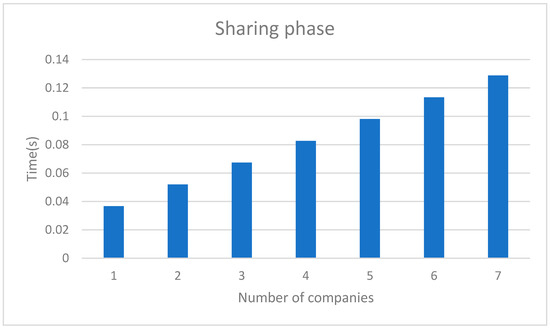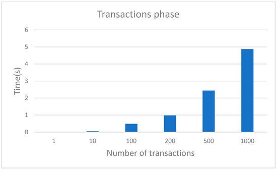 The further-detailed computational resource usage in the sharing phase by the number of companies maintaining the blockchain is displayed in Figure 15. It is clear that the increasing number of companies has led to the linear increase of computational resources required for the sharing phase. The computational resource usage during the transactions phase relative to the number of transactions is depicted in Figure 16. As the number of transactions increases, resource usage shows a significant rise, highlighting the computational cost associated with the higher transaction volumes.
