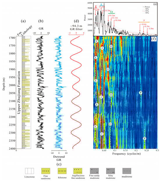 Depth–domain analysis of the GR data series in the EP17 borehole. (a) Lithostratigraphy and lithology; (b) GR data series; (c) GR data series detrended using the LOESS filter to remove the 251.906 m trend; (d) ~94.3 m Gaussian bandpass filter (passband: 0.0010344 ± 0.0001 cycles/m); (e) 2πMTM spectral analysis of the detrended GR series, where E represents long eccentricity, e represents short eccentricity, O represents obliquity, and P represents precession.; (f) eFFT evolutionary spectral analysis of the detrended GR series, where E represents long eccentricity, e represents short eccentricity, O represents obliquity, and P represents precession.