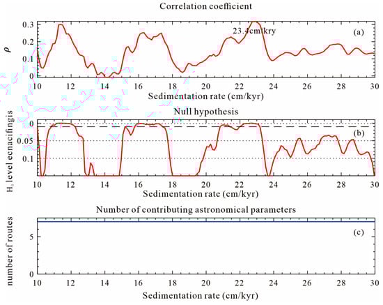 Correlation coefficient method (COCO) analyses of geophysical logging data from the EP17 borehole. (a) COCO analysis of Well EP17, testing sedimentation rates within the range of 10–30 cm/kyr with a step size of 0.1 cm/kyr and 5000 Monte Carlo simulations,ρ Indicates the size of the correlation coefficient; (b) Null hypothesis of Well EP17; (c) Astronomical orbital matching numbers of Well EP17.