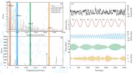 Under the optimal sedimentation accumulation rate (SAR) constraint, spectral analysis was conducted using the Multi-Taper Method (MTM) to identify Milankovitch cycles, including eccentricity, obliquity, and precession. Evolutionary power spectra and wavelet transforms were employed to visualize temporal variations in the cyclic signals. Gaussian bandpass filters were utilized to extract dominant orbital periods: 405 kyr long eccentricity, 100 kyr short eccentricity, 40 kyr obliquity, and 20 kyr precession. These periods were cross-validated against theoretical La2004 orbital solutions to confirm their astronomical origins. By leveraging the 405 kyr eccentricity cycles as a chronostratigraphic backbone, a ‘floating’ astronomical timescale was constructed through time–depth conversion, which was then anchored to absolute radiometric ages (e.g., biostratigraphic datums) to establish a high-resolution calibrated astronomical timescale with an uncertainty of ±20 kyr [29].