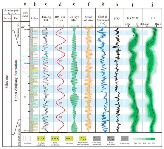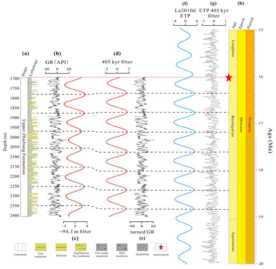 According to the biostratigraphy and stratigraphy of the well, the results of zircon 206Pb/238U dating in the area, and the Geologic Time Scale 2020 [34,35], the absolute age of the top interface of Well EP17 is about 15.98 Ma for the Early-Middle Miocene top interface, which is used as an anchor point in this paper to establish an absolute timescale (ATS) for the upper section of the Pearl River Formation in Well EP17 (Figure 5). The sedimentary record from the upper section of the Zhujiang Formation in Well EP17 preserves seven stable 405 kyr eccentricity cycles. These cycles were compared with the 405 kyr filtered curve of the La2010d theoretical astronomical orbital periods spanning from 15 to 20 Ma. The results indicate a strong consistency between the 405 kyr eccentricity cycle curve of Well EP17 and the theoretical astronomical orbital cycle curve (Figure 5c,d), thereby further validating the accuracy and reliability of the time series analysis.