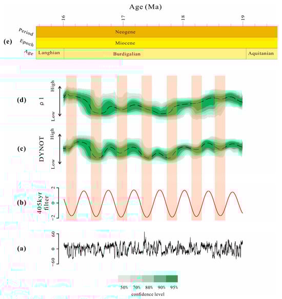 Astronomical forcing analysis of sedimentary noise models. (a) Tuned GR data curve; (b) 405 kyr filtered curve (passband: 0.0024656 ± 0.0001 cycles/kyr); (c) DYNOT sedimentary noise model; (d) ρ1 correlation coefficient model; (e) International Chronostratigraphic Chart.