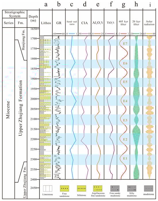Climatic characteristics and sedimentary responses driven by astronomical orbits. (a) Lithologic profile of Well EP17; (b) Detrended GR data curve; (c) Sand–shale ratio curve; (d) Vertical distribution curve of CIA values; (e) Vertical distribution curve of Al2O3 content; (f) Vertical distribution curve of TiO2 content; (g) 405 kyr filtered curve (passband: 0.0024656 ± 0.0001 cycles/kyr), E1–E7 represents 7 eccentricity cycles; (h) 20 kyr filtered curve (passband: 0.0024656 ± 0.0001 cycles/kyr); (i) Average summer insolation at 20° N [5].