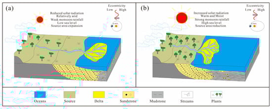 This study proposes two typical sedimentary patterns in the upper section of the Zhujiang Formation in the Enping Sag, the formation mechanisms of which are closely related to paleoclimate changes controlled by Milankovitch orbital parameters (Figure 9). Pattern I (Figure 9a) develops during the low phase of the 405 kyr long eccentricity cycle, when the decrease in Earth’s orbital eccentricity makes the orbit more circular, reducing the distance difference between perihelion and aphelion and thereby attenuating the precession amplitude. The orbital dynamic effects lead to a decrease in the annual mean solar radiation in mid-latitude regions, a reduction in seasonal temperature differences, and a weakening of monsoonal rainfall, creating an arid and hot paleoclimate background. Under these conditions, the source area is dominated by physical weathering, the supply of terrigenous clastics increases, and combined with the shelf exposure effect caused by sea-level fall, a progradational deltaic sedimentary system is formed. This system develops massive sandstone units with thicknesses of 8–15 m, and the sand–shale ratio significantly increases. Pattern II (Figure 9b) corresponds to the high phase of the 405 kyr long eccentricity cycle, when the increase in Earth’s orbital eccentricity makes the orbit more elliptical and enhances the precession amplitude, leading to an increase in the seasonal differences in solar radiation in low-latitude regions. The climate system response is characterized by warm and humid features, with an increase in the chemical weathering index (CIA), reflecting strong chemical weathering and an increase in the clay mineral content. Accompanying the retreat of the source area caused by rising sea levels, a retrogradational deltaic system is formed. This sedimentary unit is dominated by thick mudstone layers (single-layer thickness of 3–5 m) intercalated with thin layers of fine sandstone.