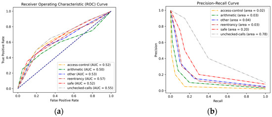 To visualize the model effectiveness among various vulnerability categories, both the ROC curve and the precision–recall (PR) curve were plotted for analysis (Figure 4). The ROC curve reveals similar suboptimal model performance across six classes, with the area under the curve (AUC) values hovering around 0.55. However, in the case of imbalanced datasets where positive class is infrequent, the ROC curve can be misleading, as it might indicate high performance even if the model performs poorly on the positive class. Thus, the PR curve offers a more insightful evaluation for our task, as it focuses on the positive class (i.e., the vulnerability class) and aims to mitigate the significant costs associated with false positives (i.e., falsely detecting vulnerabilities). The results align with the classification report, as the area under the PR curve for unchecked calls stands at 0.78, indicating that the model demonstrates moderate effectiveness when predicting the majority class.