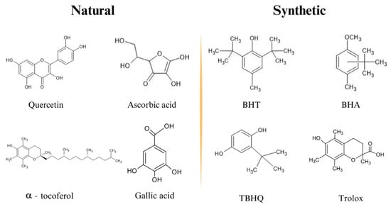 Division of chemical compounds with organic structure commonly used as reference substances in methods for assessing antioxidant potential. BHT—butylated hydroxytoluene; BHA—butylated hydroxyanisole; TBHQ—tert-butylhydroquinone.