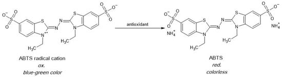 The 2,2′-azino-bis-3-ethylbenzthiazoline-6-sulfonic acid (ABTS) assay is based on the generation of the green-blue ABTS•+ radical, which can be reduced by antioxidants. The reduction of the radical results in a decrease in the color intensity of the solution, and this change is proportional to the reductant content in the test sample (Figure 3). In spectrophotometric measurements, the wavelength used is 734 nm []. The ABTS•+ radical reacts with potassium persulfate in a 2:1 molar ratio; thus, the ABTS concentration should be at least twice that of potassium persulfate in the reaction mixture [,].