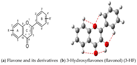 The structure of 3-HF (C15H10O3) consists of a phenyl benzopyrone skeleton with fifteen carbon atoms, in which two benzene rings (A and B) are linked through a γ-pyrone ring C, as shown in Figure 1, together with its nomenclature. All the hydrogens of the ten C-H bonds of the unsubstituted flavone (0-HF, C15H10O2) can be replaced by a hydroxyl group (-OH) as mono-hydroxyflavones. As a result, in addition to the unsubstituted flavone (0-HF), there are seven unique mono-hydroxyflavones, 3-HF, 5-HF, 6-HF, 7-HF, 8-HF, 2′/6′-HF, 3′/5′-HF, and 4′-HF. Here, 5-HF was the most stable mono-hydroxyflavone in the gas phase, in agreement with an earlier study [10], and it was also the most stable mono-hydroxyflavone in DMSO solvent obtained from the present study. 3-HF is unique because its -OH group replaces a single hydrogen atom on the γ-pyrone C-ring. Among the intramolecular hydrogen bonds (HBs) formed, the one within the γ-pyrone C-ring was the most significant, as highlighted in the structure shown at the bottom right of Figure 1.