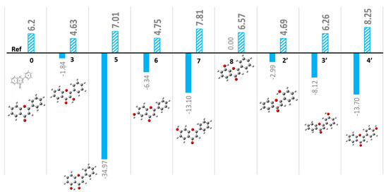 The stability and electronic properties of mono-substituted hydroxyflavones (n-HFs) have been systematically calculated using DFT calculations. The ground electronic states of mono-substituted flavones (n-HF where n=0 for unsubstituted flavone, n = 2–8 for n-hydroxyflavones) were optimized in DMSO solvent. Due to the symmetry and the rotations around the C2-C1′ single bond at room temperature, the mono-substituted flavones on the phenyl B-ring would be practically the same in the measurements, although they are theoretically not identical [13]. For example, the 2′-HF and 6′-HF and the 3′-HF and 5′-HF pairs are hardly distinguished by room-temperature NMR measurements. As a result, we only studied 2′-HF (for 6′-HF) and 3′-HF (for 5′-HF). It was noted that the 2′-HF/6′-HF pair could be more different from the 3′-HF/5′-HF pair, as the former on the B-ring may engage with intramolecular interactions with the C-ring, forming certain hydrogen-bond networks, theoretically [10]. Figure 2 compares the stability of the n-HF compounds, such as the total energies and dipole moments. Here, the unsubstituted flavone is presented as a reference. The total electronic energies of these eight n-HFs provide insights into their relative stability, which follows the following order: 5-HF > 4′-HF ≈ 7-HF > 3′-HF > 6-HF > 2′-HF > 3-HF > 8-HF.