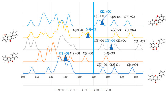 Half of the n-HF isomers, such as 3-HF, 5-HF, 8-HF, and 2′-HF, were able to form intramolecular hydrogen bonding with oxygens (O1 or O3 on the γ-pyrone C-ring) on adjacent carbon atoms, which was reflected by the chemical shifts of the isomers. The environment of a 13C nucleus can also be affected in an inductive, through-space (field effect), or resonance-based manner by substituents that are bonded to its carbon framework (skeleton). These effects, which became apparent in the 13C substituent chemical shift analyses, caused the associated chemical shifts to vary in a systematic and predictable manner. Figure 3 plots the 13C-NMR spectra of these n-HFs with respect to 0-HF. The full width at half maximum (FWHF) of the spectra was given by 0.20 ppm. The 13C-NMR spectra of all the n-HF isomers are given in Figure S3 in the Supplementary Materials.