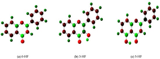 Natural bond orbital (NBO) of 0-HF (a), 3-HF (b), and 5-HF (c). The carbons in the compounds that directly bond with oxygens are positively charged (in green color in the figure), such as C(4), C(9), C(2), and C(n)-OH, as the carbons are deshielded. The rest of the carbon atoms in the flavones/hydroylflavones are negatively charged (red color in the figure), and are shielded. The calculated NBO values are given in Table S3 in the Supplementary Materials.
