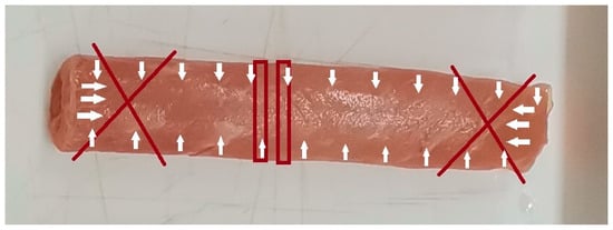 The raw material of the tested sample was pre-chilled pork loin (Longissimus dorsi). A total of 69 cylinders with a length of 80 mm and a diameter of Ø15 mm were cut from the fat-free parts of the whole meat, parallel to the muscle fibers, and their initial weight was measured. Only normal-quality meat was used for the experiment. The normal meat quality was verified with a digital pH meter (testo 206 pH2) in the middle of the cylinder shell: the pH of each test sample fell within the normal range (min pH: 5.49, max pH: 5.97).