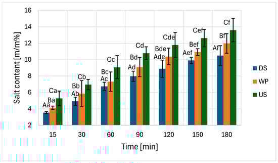 Average salt content and its standard deviation during curing with the results of the Tukey test. Treatments: DS: dry salting, WP: wet curing, US: wet curing + ultrasound. A, B, C: separable processes. a, b, c, d, e, f: separable treatment times. Significance: for treatment F(2;42) = 34.252; p < 0.001, for time: F(6;42) = 72.368; p < 0.001.