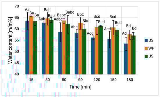 Average water content and its standard deviation during curing with the results of the Tukey test. Treatments: DS: dry salting, WP: wet curing, US: wet curing + ultrasound. A, B: separable processes. a, b, c, d: separable treatment times. Significance: for treatment F(2;42) = 13.451; p < 0.001, for time F(6;42) = 11.957; p < 0.001.