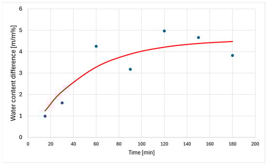 Therefore, the expected value of the moisture content was different in the case of dry and wet curing, but the significance of the ultrasonic treatment could not be confirmed on the sample size examined. The change in the moisture content was examined over time using regression. The linear regression was not significant (F(1;5) = 6.541; p = 0.51); so, we fitted a saturation curve (water difference~A × (1 − EXP(−B × Time))) (see Figure 4). The equation of the saturation function is