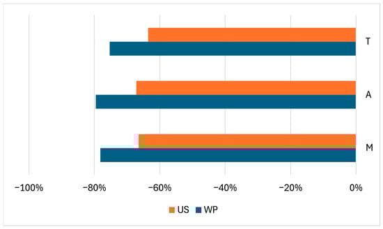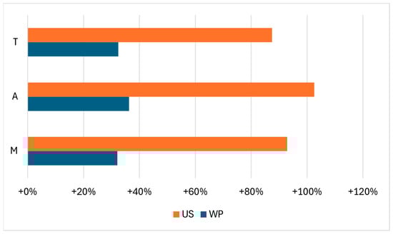 The effect of wet and ultrasound-assisted wet curing processes on modifying the water diffusion coefficient compared to dry salting (x-axis: Variation in diffusion coefficient in percent of dry salting). WP: wet curing, US: wet curing + ultrasound. Fitted models: M: Martuscelli, A: Abbasi, T: Telis.