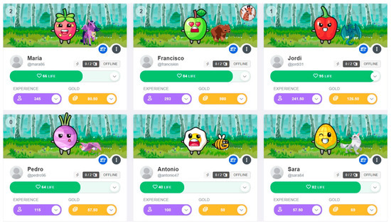 Example of student avatars from the FantasyClass platform. Each avatar represents an anthropomorphic fruit or vegetable character, as part of the course narrative that immersed students in a magical storyline on Chaos Island. The use of this screenshot has been authorized by the creator of FantasyClass.