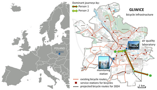 Location of Gliwice in Poland, a map with bicycle infrastructure in the area, a monitoring station, and an air quality laboratory were used in the study, as well as the dominant journeys of the participants (green dots indicate the starting and ending points of the journeys).