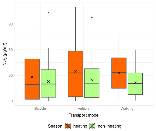 Boxplots of NO2 by transport mode during non-heating and heating seasons. Boxes represent the 25th to 75th percentile, the central dark line is the median, bars outside the box min-max, the cross is the mean value, and the circles are the outliers.