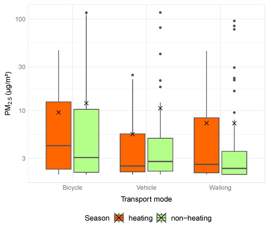 Boxplots of PM2.5 by transport mode during non-heating and heating seasons. Boxes represent the 25th to 75th percentile. The central dark line is the median. Bars outside the box are the minimum and maximum. The cross is the mean value, and the circles are the outliers.