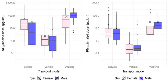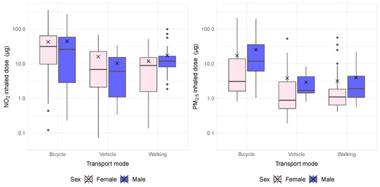 Doses of NO2 and PM2.5 inhaled by the female participant and the male participant per km of trip by different modes of transport. Boxes represent the 25th to 75th percentile. The central dark line is the median. Bars outside the box are the minimum and maximum. The cross is the mean value, and the circles are the outliers.