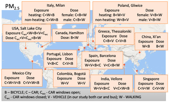 Figure 6 summarizes the estimated inhaled dose of PM2.5 across different modes of transport in selected urban areas, emphasizing the role of physical activity and ventilation rate in personal exposure. In cities such as Barcelona (Spain) and Xi’an (China), just as in our study in Gliwice, the highest doses were associated with walking or cycling, despite these modes not always corresponding to the highest ambient concentrations. This is likely due to increased respiratory rates during physical activity, which enhance pollutant uptake. In contrast, the lowest doses were generally recorded inside private vehicles with closed windows, as seen in Milan (Italy) and Salt Lake City (USA). In Bogotá (Colombia) and Hamilton (Canada), cycling led to significantly higher doses, further illustrating the influence of exertion on inhaled pollutant load. These findings confirm that, beyond ambient concentrations, individual activity level and transport context are key determinants of the actual dose of PM2.5 received.