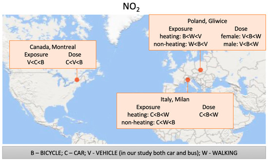 Figure 7 summarizes NO2 exposure levels associated with different modes of transport in three urban locations: Montreal (Canada), Milan (Italy), and our study in Gliwice (Poland). Across all cases, individuals traveling by vehicle (V) experienced the lowest NO2 concentrations, while higher exposures were generally observed among those walking (W) or cycling (B). In Montreal, the exposure ranking was V < C < B, suggesting a clear protective effect of enclosed vehicle environments. Similarly, in Milan, exposure during the heating season followed the pattern C < B < W, whereas, in the non-heating period, car use offered the greatest protection (C < W < B). In Gliwice, seasonal differences were again apparent: during the heating season, cyclists were the most exposed (B < W < C), while in the non-heating period, the highest concentrations were observed among pedestrians (W < B < C). These findings emphasize that mode of transport, seasonal conditions, and the degree of physical enclosure significantly affect NO2 exposure in urban settings, with walking and cycling consistently associated with increased concentrations relative to vehicle travel.