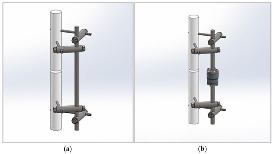 Experimental setup for testing the modified external fixator according to Mitkovic. (a) The sensor is inserted between the joints of UETM. (b) The sensor is integrated in the middle of the vertical rod.