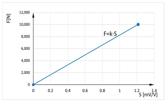 Since the sensor does not measure force directly but detects it through deflection, calibration is performed before use, through the manufacturer’s application. When an axial load is applied, the measurement body deforms, which leads to strain near the strain gages. These gages are configured to create a Wheatstone bridge circuit, generating an output signal proportional to the variation in resistance and, consequently, the magnitude of the force, when it is under voltage. The relationship between the force F [N] and the sensor sensitivity S [mV/V] is linear (). The calibration factor k is determined by manufacturer based on two reference points: the origin and the maximum nominal load of 10 kN, which corresponds to a generated electrical signal of 1.2144 mV/V (Figure 2).