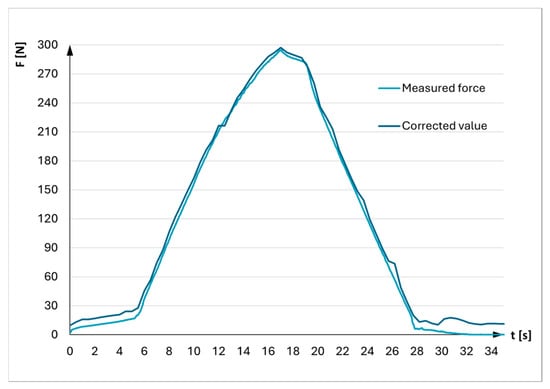 The accuracy of the UETM control software was verified at the very beginning to minimize measurement errors when comparing the force exerted by the UETM with the force detected by the sensor placed between its joints (Figure 3a). The sensor reading served as a reference point. The result indicated that the force delivered by the UETM was slightly higher than the reference value. A correction factor of 1.0164 was determined by comparing these values. Therefore, the force values delivered by the UETM were adjusted by dividing them by this correction factor during experiments.