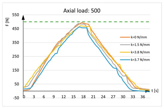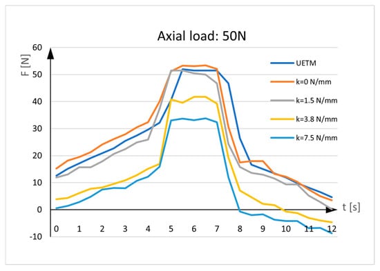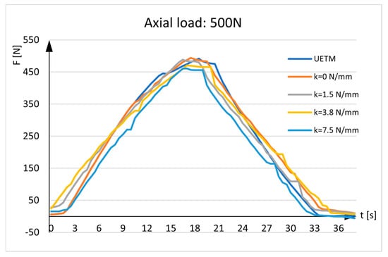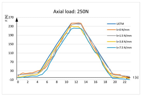 Figure 5, Figure 6 and Figure 7 show a comparative view of forces that load the fixator, which are delivered by the UETM and represent the weight of the patient, as well as values of the forces measured by the sensor at different loads and different rigidity of the springs (12 measurements in total).