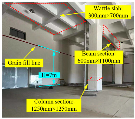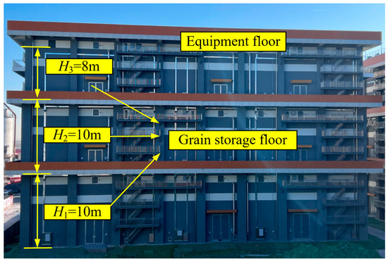 The multi-floored grain warehouse is a type of multi-story building structure designed for bulk grain storage. Featuring large height, width, and capacity, this structural form enables the warehouse to carry far heavier loads than typical civil frame structures under high grain-filling and heavy-stacking conditions. In China’s economically developed but land-constrained coastal regions, such warehouses have become the preferred solution for national grain reserves and emergency supply systems [1] (Figure 1 and Figure 2). The grain load stored within can reach and even exceed 100,000 tons. In addition to substantial vertical loads, the walls and columns must also resist significant lateral forces, making the structure’s seismic performance critical to ensuring a stable and secure post-earthquake grain supply.