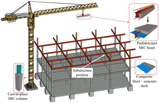 On the other hand, due to the need for efficient spatial utilization, the increasing grain-filling height in multi-story grain warehouses has led to a substantial enlargement of the structural dimensions. This expansion has resulted in extensive on-site wet construction work, which not only causes environmental pollution but also compromises the flexibility and feasibility of process layout [2,3]. In response, Jinquan Zhao et al. proposed a novel structural system tailored for multi-story grain warehouses by introducing the Composite Structure of Steel and Concrete (CSSC) structure (defined according to JGJ 138-2016) [4], which demonstrates the superior mechanical performance of the CSSC system compared to conventional configurations [5,6,7], while also offering superior corrosion and fire resistance compared to conventional concrete-filled steel tube structures [8,9,10]. As illustrated in Figure 3, this CSSC-based system significantly minimizes the cross-sectional dimensions of the warehouse. To validate the performance of this system, Zhao and colleagues conducted a series of experimental studies on critical components such as beam–column joints, wall panels, and connection details under various loading scenarios [11]. The results revealed that grain loads adversely affect the seismic performance of the CSSC structural system; under full-storage conditions, the bearing capacity and peak displacement of the joints were reduced by 10.8% and 15.7%, respectively, with a noticeable intensification in crack propagation along the beams.