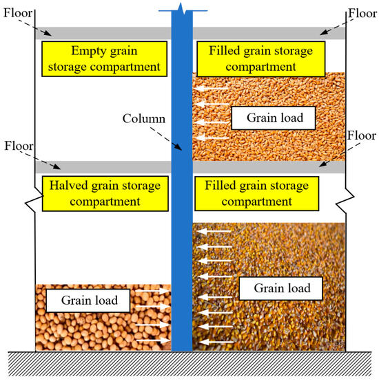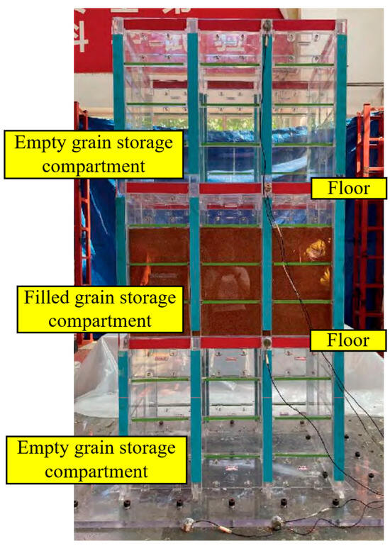 At present, experimental testing and finite element analysis are the primary methods used to investigate the seismic performance of multi-floored grain warehouses. Building on these approaches, numerous studies have explored the structural behavior of such warehouses under varying grain storage conditions through both physical experiments and numerical simulations. For instance, Qikeng Xu et al. [12] conducted shaking table tests using scaled organic glass models of multi-floored grain warehouses, revealing that the dynamic characteristics of the structure vary significantly under different loading conditions; the experimental setup is illustrated in Figure 4. Their results demonstrated that grain contributes to both the mass and stiffness of the system, making it imperative to account for these differences in seismic evaluations. In addition to experimental studies, finite element simulations have also been employed. Likun Liu [13], using Abaqus (6.14), analyzed wall deformations of the grain warehouse under different grain-loading conditions and found considerable deviations from conventional frame structures, suggesting that standard design models may not be directly applicable. Similarly, Zhiwei Gu [14,15] developed finite element models in ANSYS 2021 R2 (ANSYS, Inc., Canonsburg, PA, USA) to perform fragility analyses across various loading configurations. Their results indicated that both the gravity and lateral movement of stored grain adversely affect the structure, with simultaneous seismic and grain-loading actions significantly increasing the risk of floor damage. Notably, the structural collapse behavior varied markedly among scenarios, with full-storage conditions leading to rapid plastic deformation and a dramatic rise in failure probability. While these studies provide valuable insights for seismic design, most focus only on empty or fully loaded states, thus failing to address the diverse vertical grain-loading configurations commonly encountered in real-world grain warehouse operations (Figure 5).