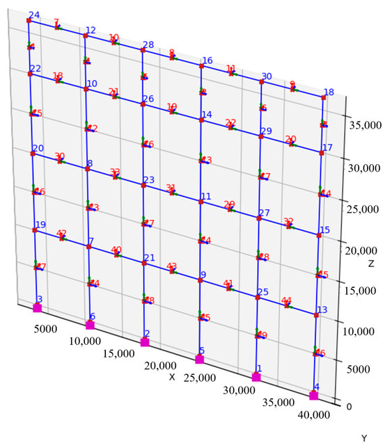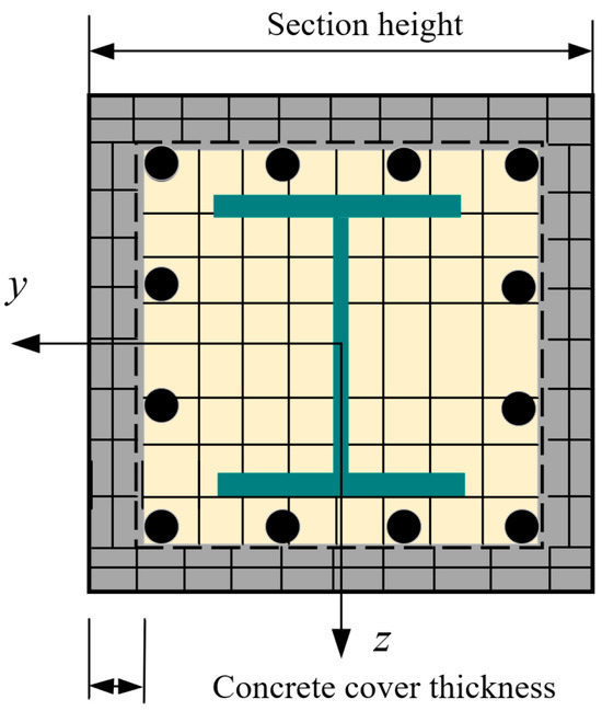 The frame was modeled in OpenSees (3.3.0). Beam and column elements adopted the distributed plastic hinge element dispBeamColumn for its accuracy and convergence. Beam–column joints were simulated using the joint2D element. The material behavior of concrete and steel was modeled with Concrete02 and Steel02, respectively. Existing studies [18,19,20] have demonstrated that the selected element types in OpenSees can effectively capture the mechanical behavior of concrete structures. Accordingly, the same elements and material models are adopted in this study for simulation. To capture composite action accurately, both concrete and steel sections were divided into ten fibers; an example of column section discretization is shown in Figure 7, Figure 8 and Figure 9, illustrating the finite element model, where the y-direction represents the five-span frame width and the z-direction of the frame height. All parameters match those of the prototype structure. Grain-induced lateral and vertical pressures were simulated by applying horizontal line loads to columns and vertical line loads to beams at each floor level, with corresponding nodal masses adjusted to reflect load conditions; the specific calculation method is as follows: according to Equation (1) of the Code for Design of Grain Storehouses (GB 50320-2014) [21], the lateral pressure at the wall base is calculated and used to determine the total lateral force on the wall, which is then divided by the column height to obtain the equivalent uniform line load on the column; beam loads are computed using Equation (2) and likewise converted into equivalent uniform line loads for application in the model.