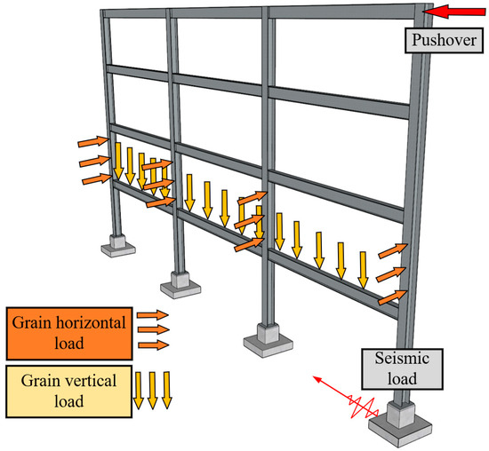 This study employed finite element simulation to investigate the seismic response of a multi-floored grain warehouse structure under the combined influence of horizontal and vertical grain loads. Various grain-loading conditions were considered, and the structural pushover curves, performance points, acceleration responses, and displacement behaviors were compared. The key conclusions are as follows: