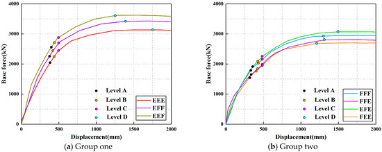 According to the calculation procedure, the roof displacement–base shear (Δ–V) curves for each case are shown in Figure 10. For clarity and comparison, the Δ–V curves were divided into four performance levels: level A and level B correspond to the first occurrence of plastic hinges at beam ends and column ends, respectively; level C indicates a maximum inter-story drift ratio of 2%; and level D marks the peak base shear. For analysis purposes, the cases were grouped into two sets; the base shear and displacement of the model at different displacement levels are listed in Table 6.