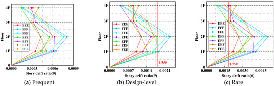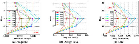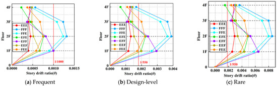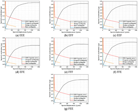 Figure 11 shows the performance points of different cases under various grain-loading conditions, as determined by the capacity spectrum method. All performance points under frequent, design-level, and rare earthquakes lie on the ascending branch of the capacity spectrum, indicating good ductility and energy dissipation. The corresponding roof displacements are all below the inter-story drift limits (1/300 and 1/50) specified in the Technical Code for Concrete Filled Steel Tubular Structures (GB50936-2014) [22], confirming that the deformation demands meet code requirements. Compared with FEE, EFE, and FFE conditions, the EEF condition exhibits significantly smaller displacements at all performance levels and is close to EFF and EEE, suggesting that grain loading on the first floor enhances initial stiffness and base shear capacity, effectively limiting seismic displacement.