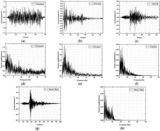 Ground motion selection. (a) Acceleration time history of Wenchuan ground motion; (b) acceleration time history of El Centro ground motion; (c) acceleration time history of Chi-Chi ground motion; (d) Wenchuan Fourier amplitude spectrum; (e) El Centro Fourier amplitude spectrum; (f) Chi-Chi Fourier amplitude spectrum; (g) acceleration time history of Hector Mine ground motion; (h) Hector Mine Fourier amplitude spectrum.