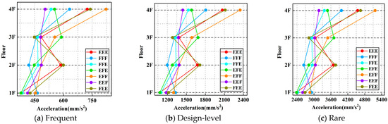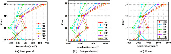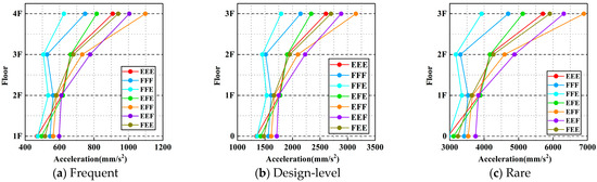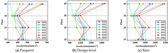 The acceleration time histories at the roof level under different ground motions are shown in Figure 17; the peak acceleration values and overall response patterns under different earthquake records vary significantly across grain-loading scenarios. This indicates that the structural acceleration response of multi-floored grain warehouses is highly sensitive to the specific grain-loading configuration. In particular, scenarios such as EFF and EEE, characterized by lighter mass in the upper floors or reduced total mass, are more prone to acceleration amplification under seismic excitation. In contrast, the FFE condition, with a relatively balanced grain distribution across floors, demonstrates more stable and moderate top-floor acceleration responses.