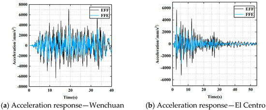 Notably, in the empty warehouse condition (EEE), the reduced structural mass and relatively higher stiffness can lead to strong resonance or near-resonance effects when the dominant frequency of the ground motion aligns with the structure’s natural frequency. This results in significantly amplified top-floor responses. For example, under the Chi-Chi earthquake, the peak top-floor acceleration in the EEE case was 104.67% higher than that in the FFE case (Figure 15), highlighting the heightened sensitivity of the structure in an empty state to specific ground motion characteristics.