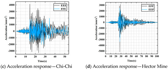 Four ground motion records corresponding to the case study were selected from the Pacific Earthquake Engineering Research Center (PEER) ground motion database. The time history curves of the different earthquake records are shown in Figure 12, and each record was scaled to match the target PGAs of 0.35 m/s2 for the frequent level (approximately 63% exceedance probability in 50 years), 1.0 m/s2 for the design level (approximately 10% exceedance in 50 years), and 2.2 m/s2 for the rare level (≈2–3% exceedance in 50 years) in accordance with seismic design categorization.