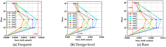 Figure 18, Figure 19, Figure 20 and Figure 21 illustrate the distribution of inter-story drift ratios of the CSSC multi-floored grain warehouse structure under four representative earthquake records. Overall, with the increase in ground motion intensity, the inter-story drift ratios under all grain-loading conditions exhibit an upward trend. The maximum drift ratio consistently appears at the second floor, indicating that this level is the critical region for lateral deformation control within the structure.