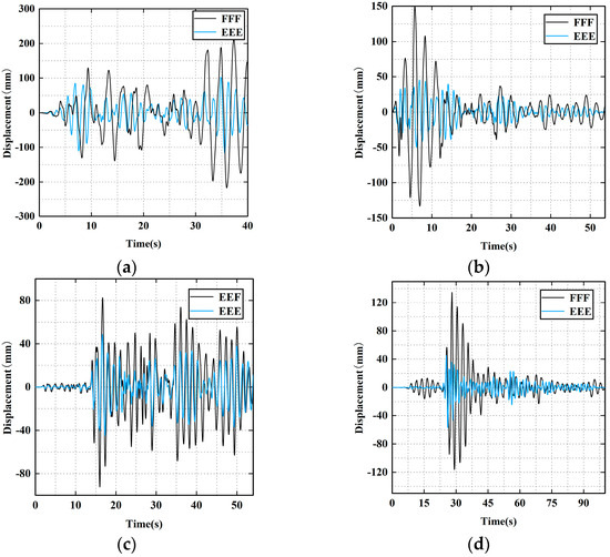 Structural displacement responses under different ground motions. (a) Displacement response—Wenchuan (Rare); (b) Displacement response—El Centro (Design-level); (c) Displacement response—Chi-Chi (Design-level); (d) Displacement response—Hector Mine (Design-level).