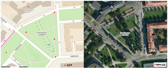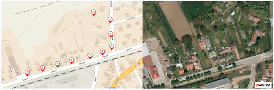 Map of the test site: Lipová street. Left—controlled points; right—an orthophoto (adapted from http://mapy.cz, accessed on 7 March 2025).