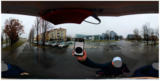 The measurement process itself is very simple with low-cost equipment. The assembled device, made of an Insta360 X3 camera and a low-cost GNSS, was placed on a geodetic pole at a height of about 2 m so that the surveyor covers a small part of the camera’s field of view. The low-cost GNSS device was paired with the phone via Bluetooth and the GNSS Controller mobile app, and after a short initialization, the GNSS RTK and RAW data collection started. For post-processing time synchronization between the images and the GNSS, the mobile device screen was recorded for a few seconds before each data collection session began in order to record a graphical clock with a very precise time (Figure 4).
