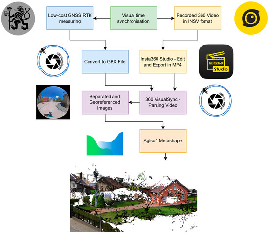 The collected data had to be first converted to video; then, the individual images were separated, the position was assigned, and a 3D reconstruction of the focused area was performed. Several software tools were used to process the measured data, including one developed for this project, 360VisualSync (https://github.com/Luckays/360VisualSync, accessed on 7 March 2025). Figure 5 shows a graph of low-cost mobile mapping processing.