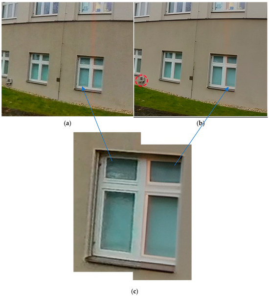 The point cloud of the facade created from the AI-edited images, using a pre-trained realesrnet-x4plus model, had a very similar accuracy to the facade from the original images. The only significant difference is in the texture of the models. Figure 12 shows the orthophotos of the facade. Both images show the cloud deformation that occurs on the upper floors of the building. More significant deformations are seen in the orthophoto with the AI-modified images. The deformations are very similar in both examples, and only in the model with the original photos are they more blurred. At first glance, the AI orthophoto is significantly sharper and more engaging, especially on the first two floors. The difference in the quality of the lower and higher floors of the facade is not only due to the higher distortion, which increases with the distance from the center of the fisheye lens, but also because part of the upper floors was partially covered by the GNSS equipment when passing close to the facade.