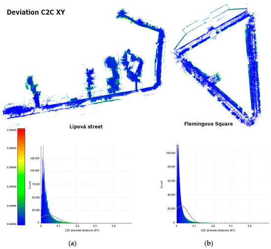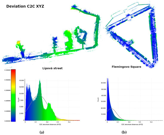 Cloud-to-cloud XYZ deviations: (a) case study of Lipová street; (b) case study of Fleming Square.